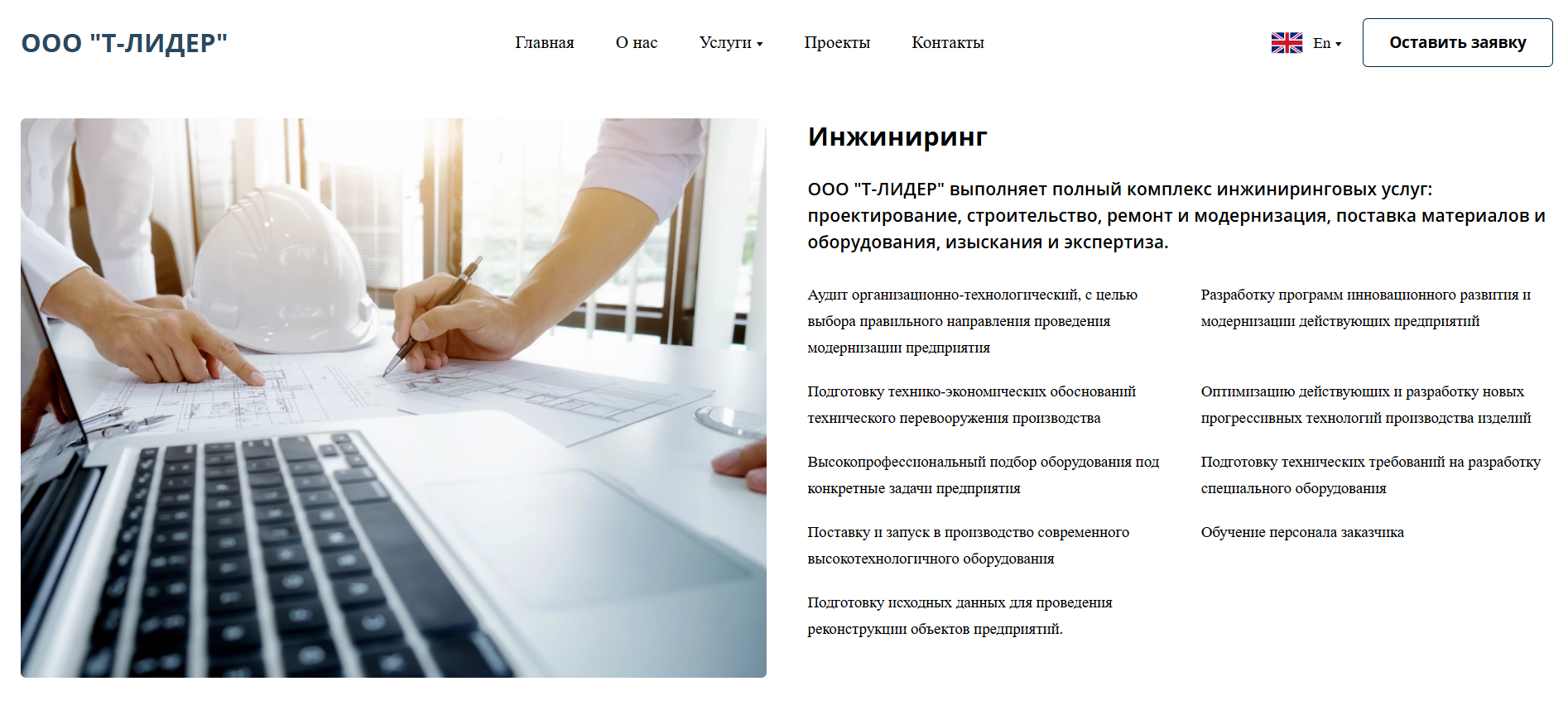 ООО "Т-ЛИДЕР" выполняет полный комплекс инжиниринговых услуг: проектирование, строительство, ремонт и модернизация, поставка материалов и оборудования, изыскания и экспертиза.